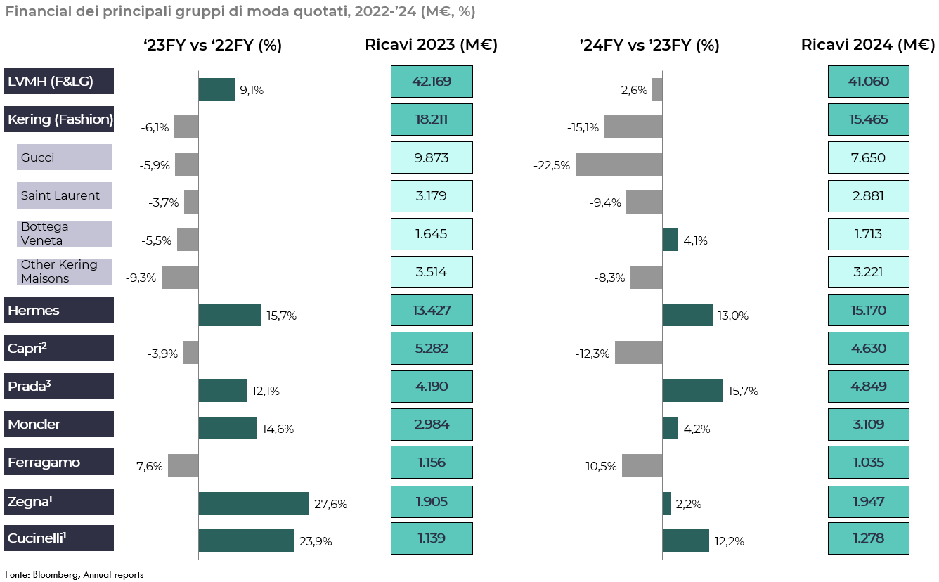 Per la prima volta dal periodo pandemico, colossi quali LVMH e Kering hanno mostrato contrazioni rilevanti dei ricavi, con il secondo particolarmente impattato dalla performance estremamente negativa di Gucci.